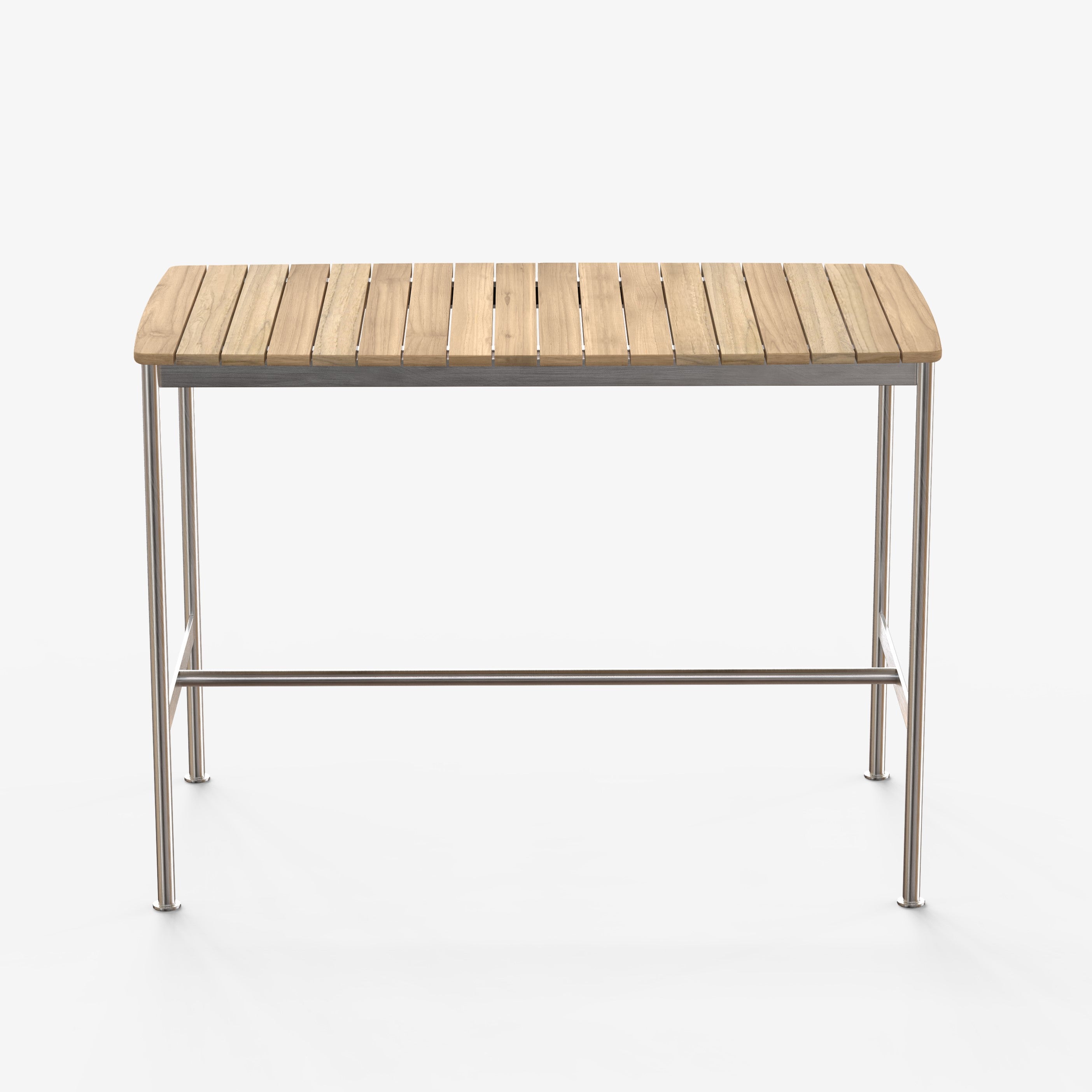 With its clean lines and weather-resistant materials, this outdoor bar table is crafted from a solid stainless steel frame topped with smooth teak slats.