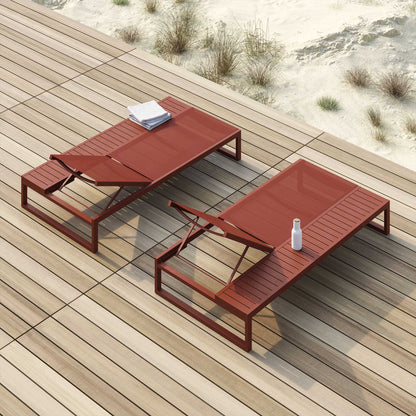 The Eos Platform Lounger is designed by Matthew Hilton and provides somewhere to recline outdoors together with a convenient side table that can be placed on either side and used for resting belongings.