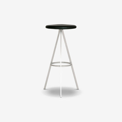 The stool pairs soft, warm leather with the elegance of the industrial stainless steel tripod legs, with the seat perfectly balancing on top of a single point where the legs meet the leather pad.
