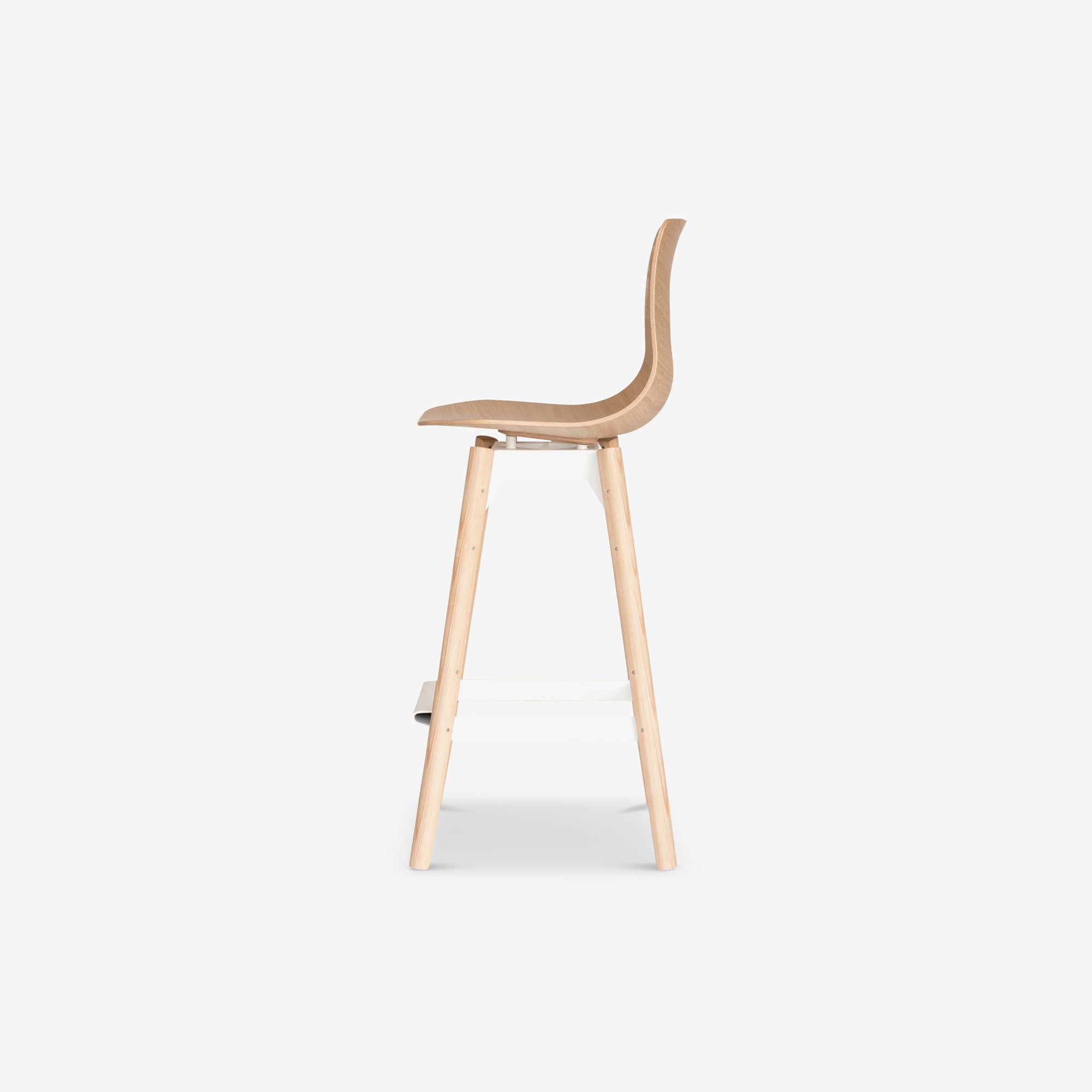 Japanese designer Shin Azumi conceived the Loku Stool using three dimensional veneer ply technology. This innovative technique allowed the seat to be moulded into a single, fluid form that is both comfortable and supportive. This plywood form sits atop tall wooden legs that make it ideal for bar dining.
