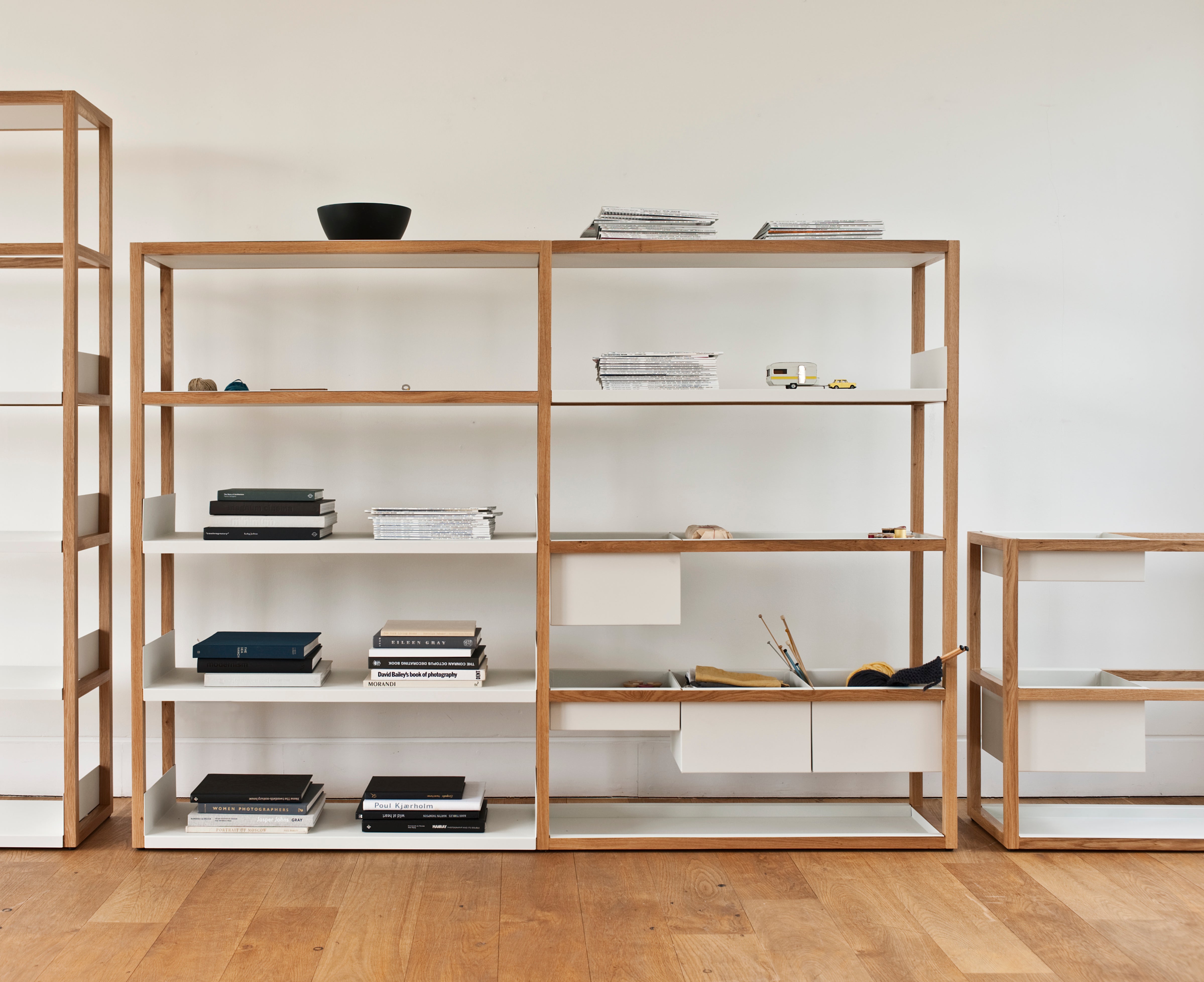 Each shelving unit can be expanded by adding extensions, offering a customizable approach to storage that grows with your needs. The system incorporates durable steel shelves, which can be combined with trays and boxes, providing flexibility for both displaying items and organising essentials. This mix of open shelving and modular add-ons makes the Lap Shelving ideal for personalising your storage, whether in a minimalist home or a professional workspace.