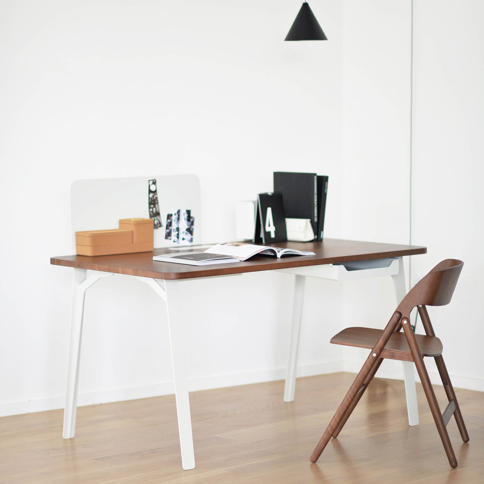 The solid wood top has a removable plate that allows easy access to a storage tray for hiding plugs and cables. Other accessories include a small drawer for a laptop or papers, a file holder and a back panel that can act as a note board or privacy screen. Its steel legs are also detachable, making the desk easy to store or transport.
