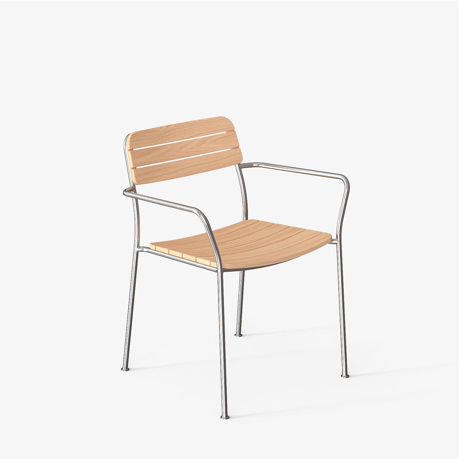 This outdoor armchair combines a robust stainless steel frame with curved teak slats for the seat and backrest, designed to provide both style and comfort. See Details