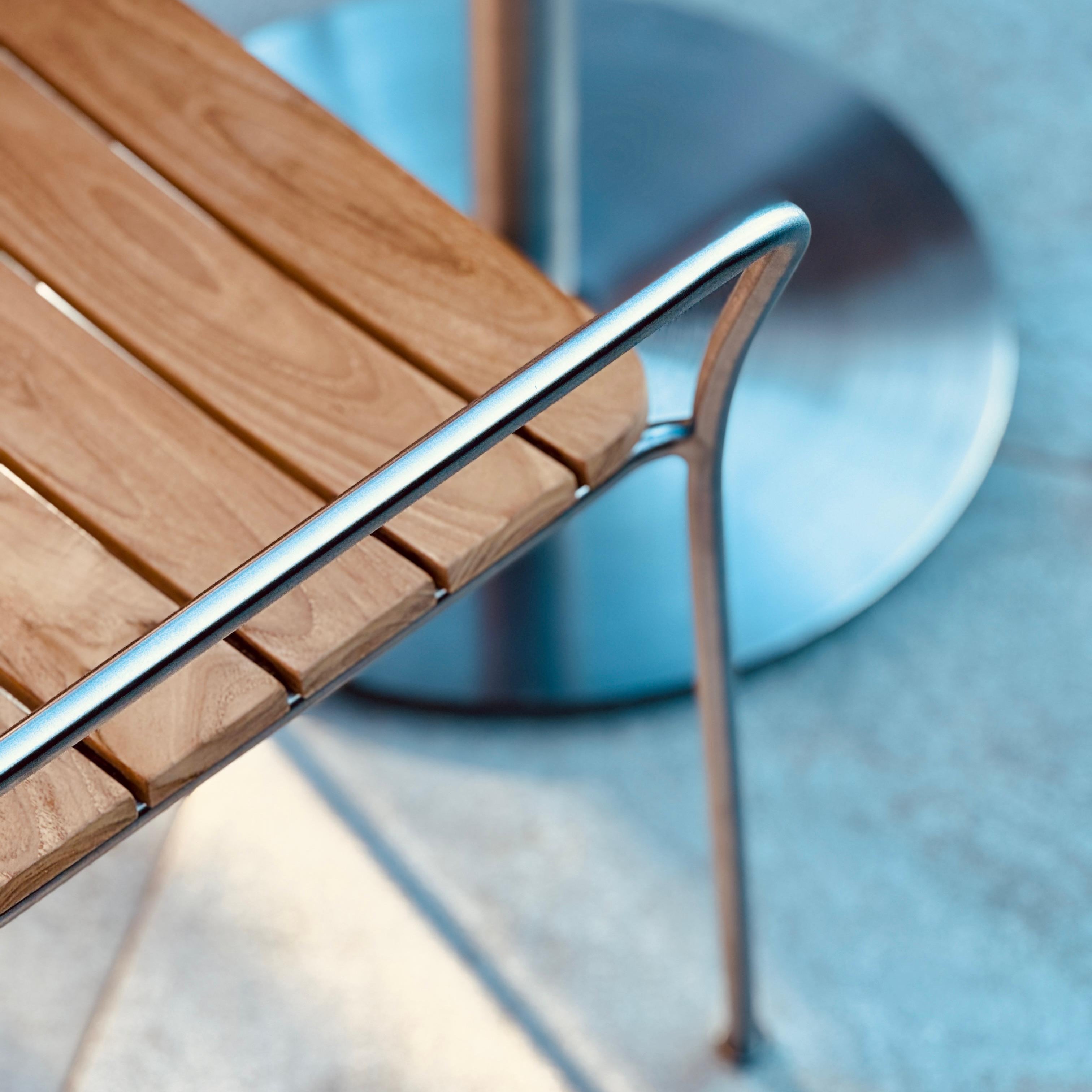 This outdoor armchair combines a robust stainless steel frame with curved teak slats for the seat and backrest, designed to provide both style and comfort. Stackable for easy storage when not in use.