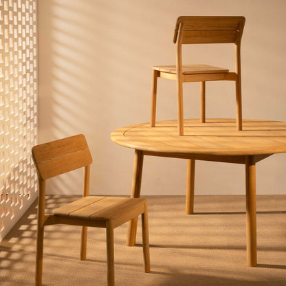 Designed by David Irwin and constructed from grade-A teak, the Tanso Side Chair is highly robust and weather resistant for outdoor use, yet its elegant and detailed aesthetic also affords it a place inside.