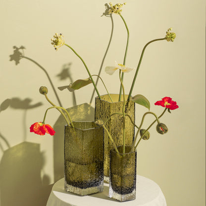 The Causeway vase’s pentagonal structure is a sleek reinterpretation of these geometric rock formations, crafted from blown glass with a textured finish that delicately diffuses light.