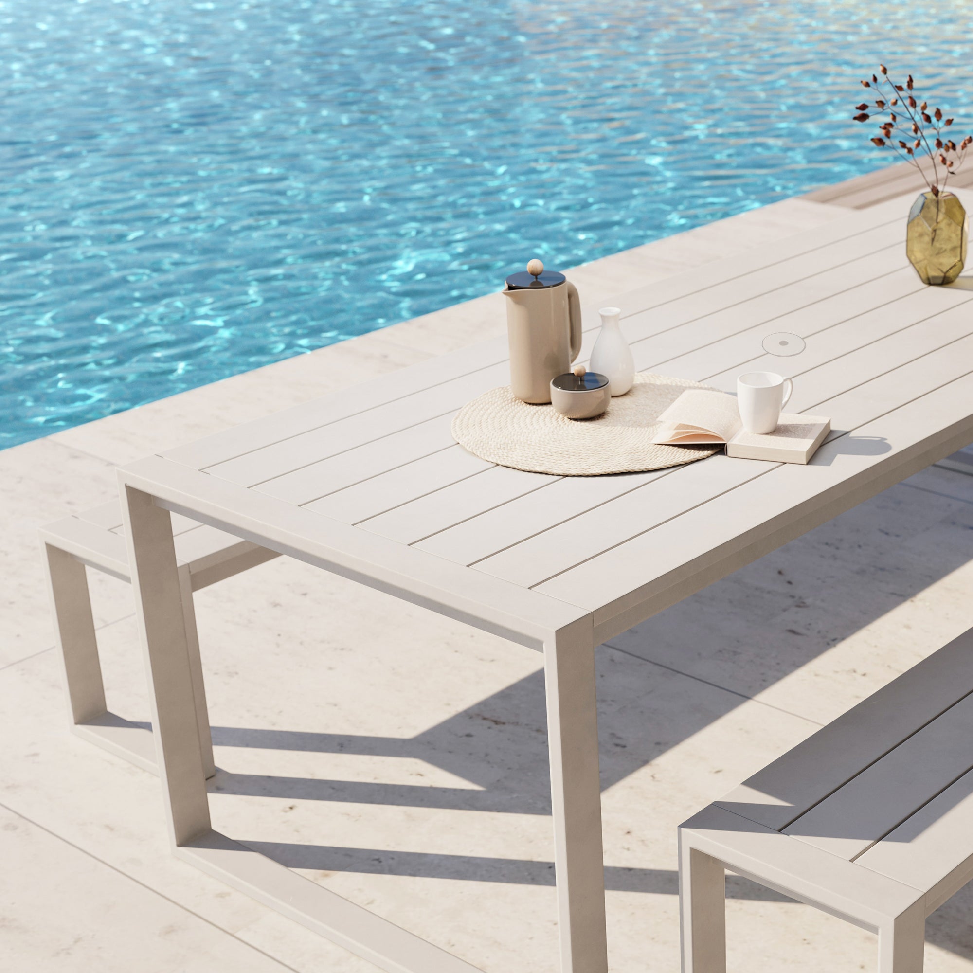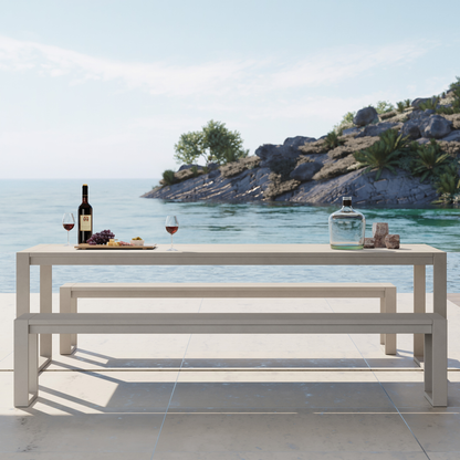 The Eos Communal Bench is a versatile outdoor bench fully constructed from powder-coated aluminium that resists weathering and rusting over time. Finished with plastic floor guides for easy movement, this bench pairs well with the Eos Communal Table.