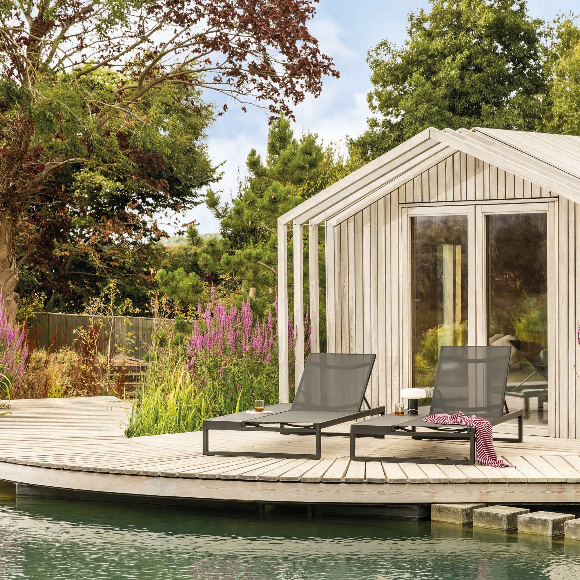 The Eos Platform Lounger is designed by Matthew Hilton and provides somewhere to recline outdoors together with a convenient side table that can be placed on either side and used for resting belongings.