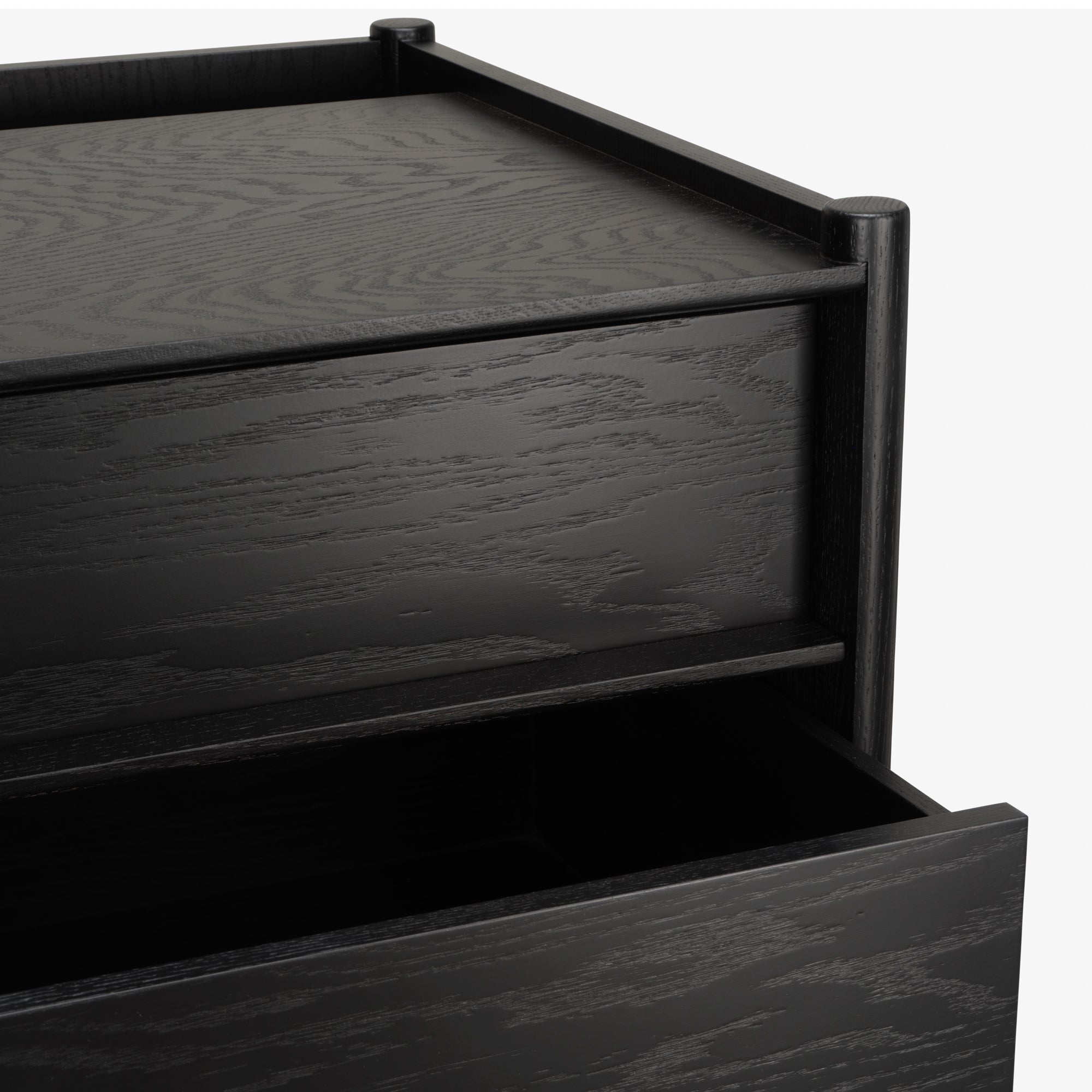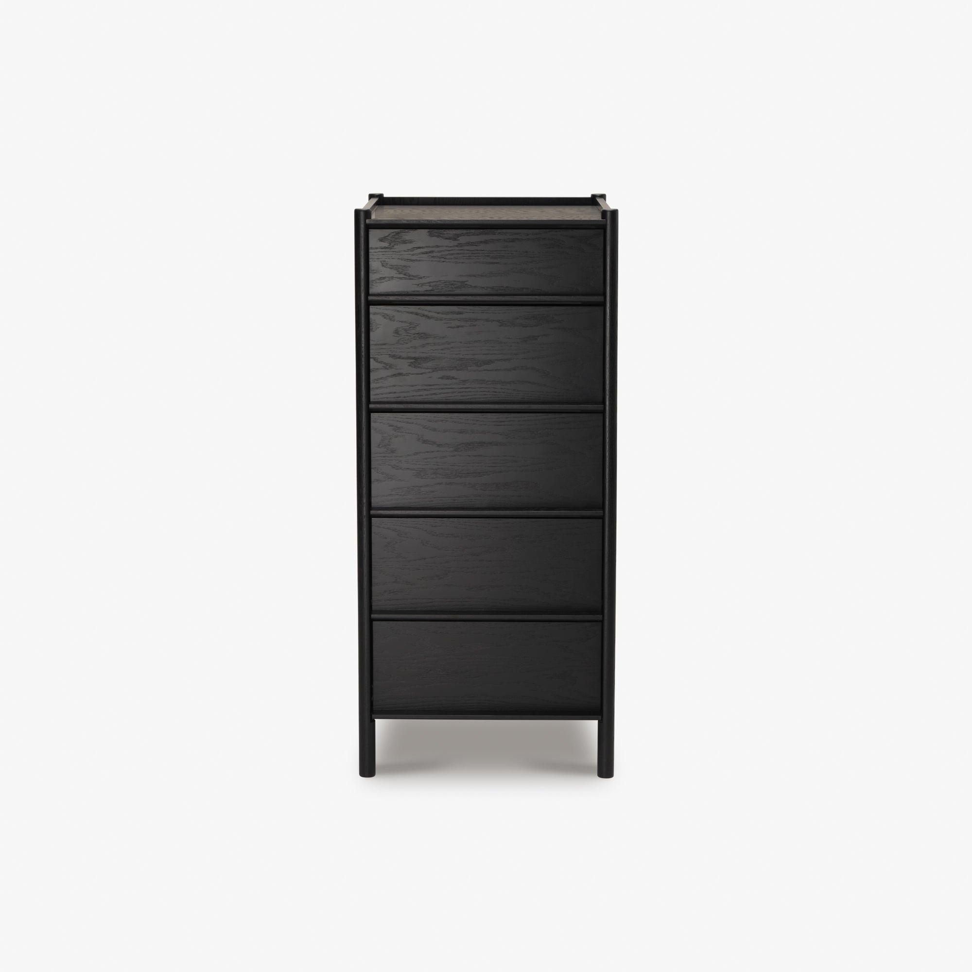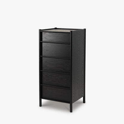 This tallboy offers ample storage with its four roomy drawers and a divided, shallower top drawer. Designed by Studio Böttger, the piece showcases their expertise in merging functionality with Nordic minimalism. The wooden form is paired with rounded legs for a refined, understated look.